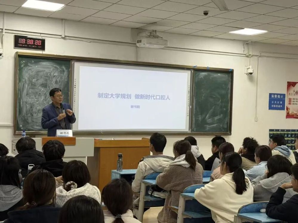 谢书阳以“你做好大学规划了吗?”开启本次授课,他指出教育、科技、人才是全面建设社会主义现代化国家的基础性、战略性支撑,并强调“科技是第一生产力、人才是第一资源、创新是第一动力”。他谈到,个人命运与国家命运紧密相连,作为新时代大学生,应主动肩负起正确运用科技、推动科技进步的时代使命。随后,他以“制定大学规划 做新时代口腔人”为重点展开讲解,结合临床病例,引导同学们科学规划大学生活,提前了解口腔执业医师资格考试、硕士研究生入学考试等相关内容,着重培养创新意识,持续提升学术素养,为学院与学校的高质量发展贡献“口腔力量”。在人工智能时代带来的机遇与挑战背景下,谢书阳特别指出,当代大学生更应主动适应技术变革,增强跨学科学习能力,将人工智能等前沿技术融入专业发展,以创新应对未来。最后,他向同学们提出希望与建议,鼓励大家尽快实现从高中生到大学生的角色转变,不断丰富知识结构,锤炼实践技能,培养系统思维与创新能力。他寄语同学们“怀仁心,修妙术”,在中华民族伟大复兴的新征程上,勇敢筑梦、踏实追梦、终将圆梦。