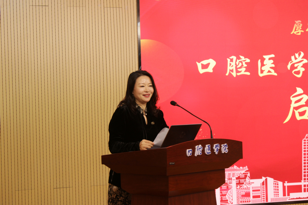 11月7日晚,口腔医学院2025年“学术文化月”活动在口腔医学中心学术报告厅启动。校党委委员、副院长田梗出席仪式并讲话。山东大学葛少华教授、企业代表、科学技术处等相关部门负责同志,学院全体师生参加启动仪式。